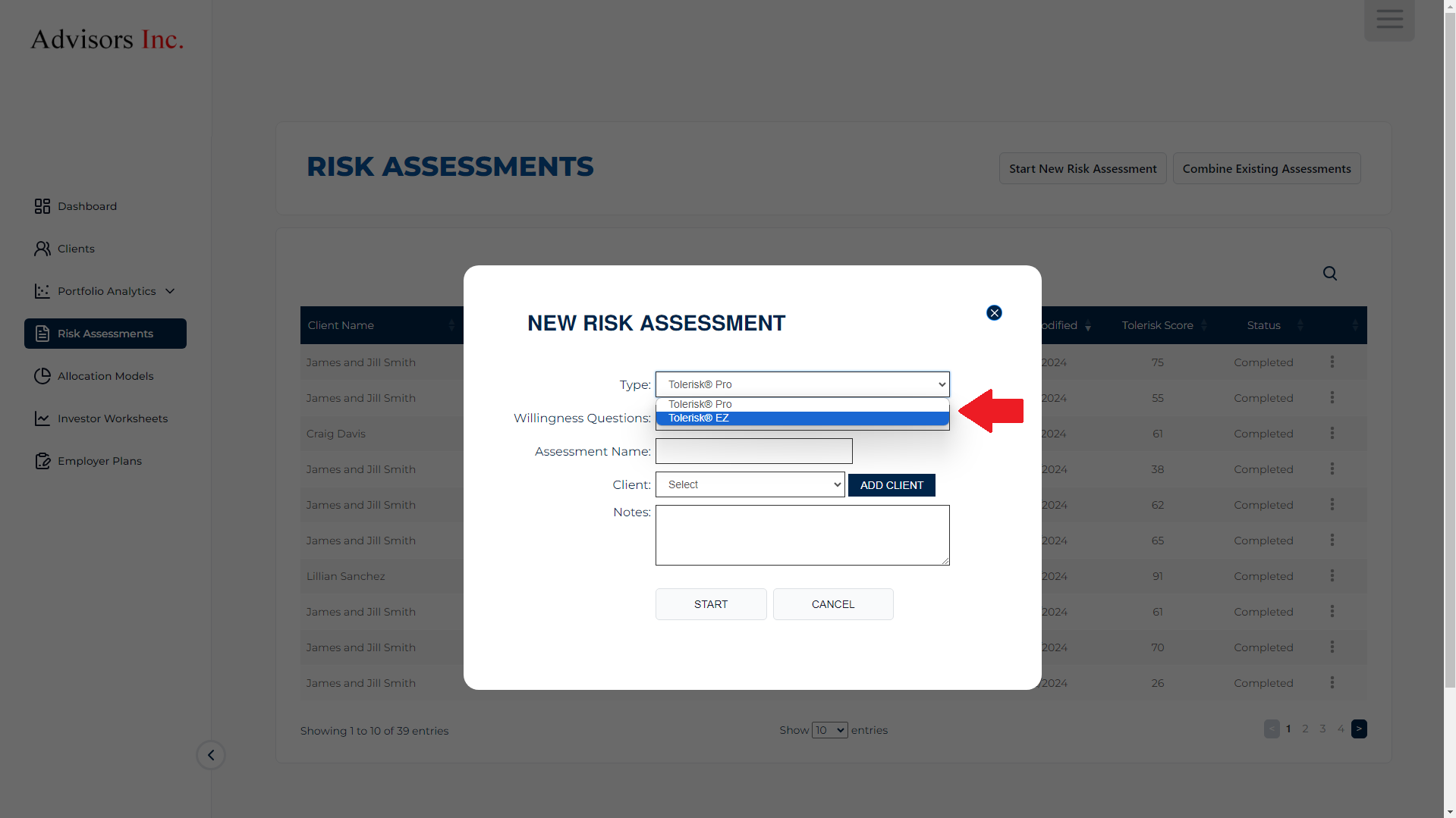 - Create a new risk assessment for your client/prospect by accessing the "Risk Assessments" tab. You can also send a link to them to fill in their assessment details by accessing the "Investor Worksheets" tab. (You can view our other user guide articles on sending Investor Worksheets and creating Risk Assessments for guidance)