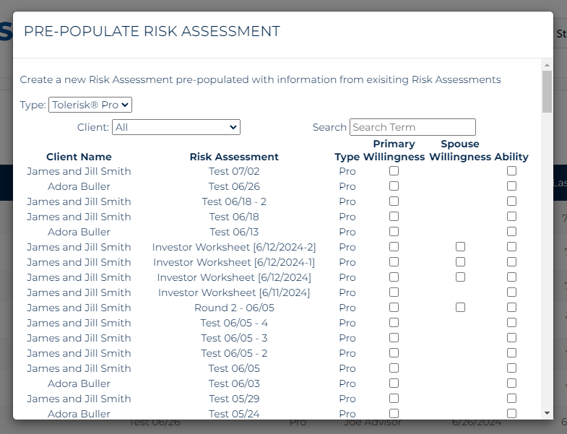 Tolerisk allows you to create pre-populated risk assessments with information from existing ones in case you want to pick and choose information from your client's past assessments, etc.