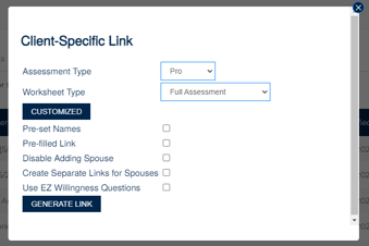 If you send a generalized Investor Worksheet link to multiple clients, you can only customize the type of questionnaire: Tolerisk Pro or Tolerisk EZ. However, when you send a link to a specific client, you can customize the link in more ways, depending on the client's case. This article will walk through the types of customizations you can make.