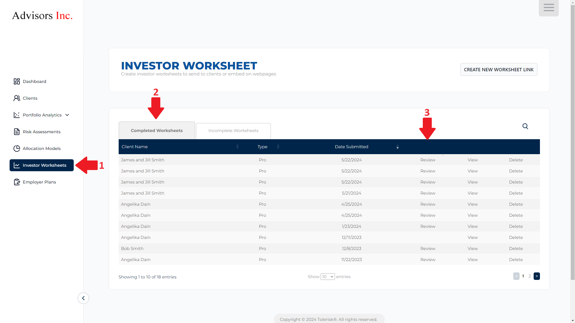 - To access the review sheet, select the Investor Worksheets page and click "review" in the row of your desired client.