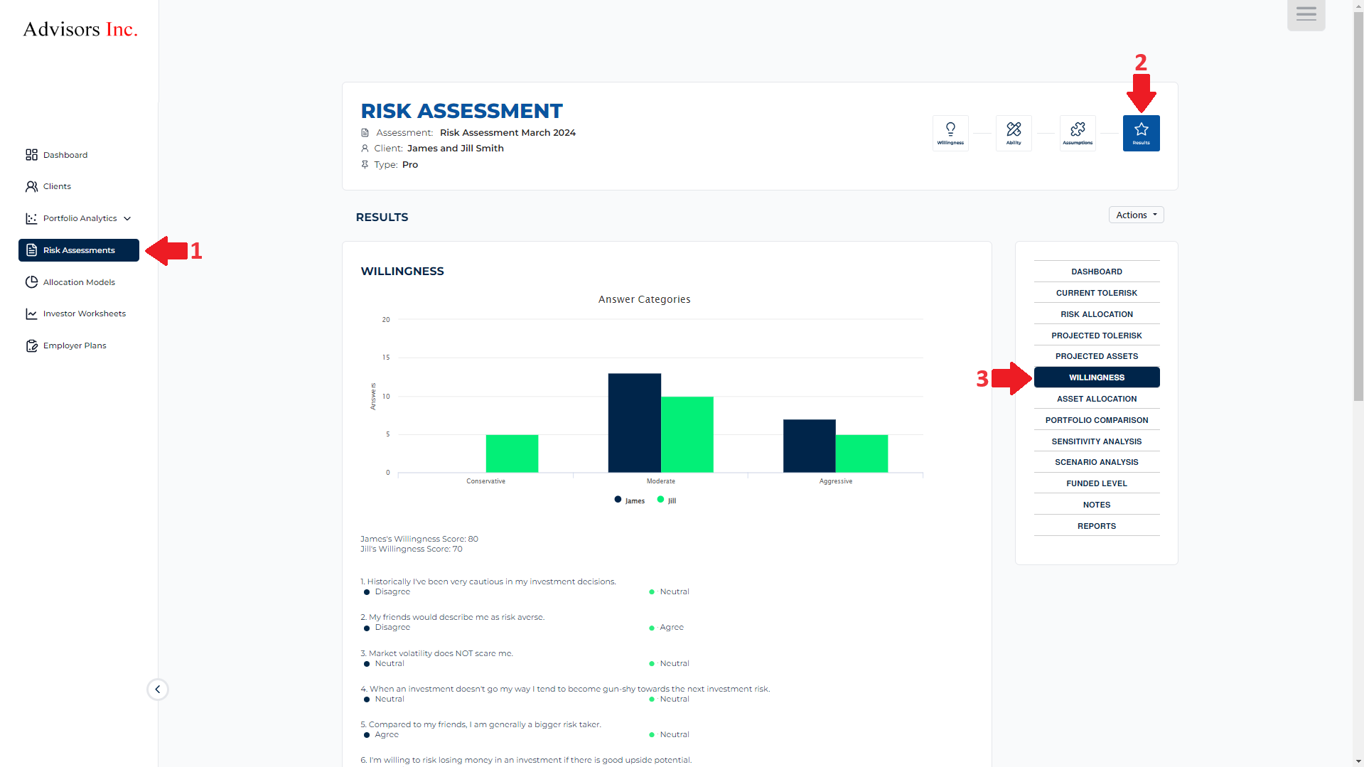 The Willingness section on the Results page of each of your client's risk assessments gives you a breakdown of their answers to the first component of the two-dimensional risk assessment.