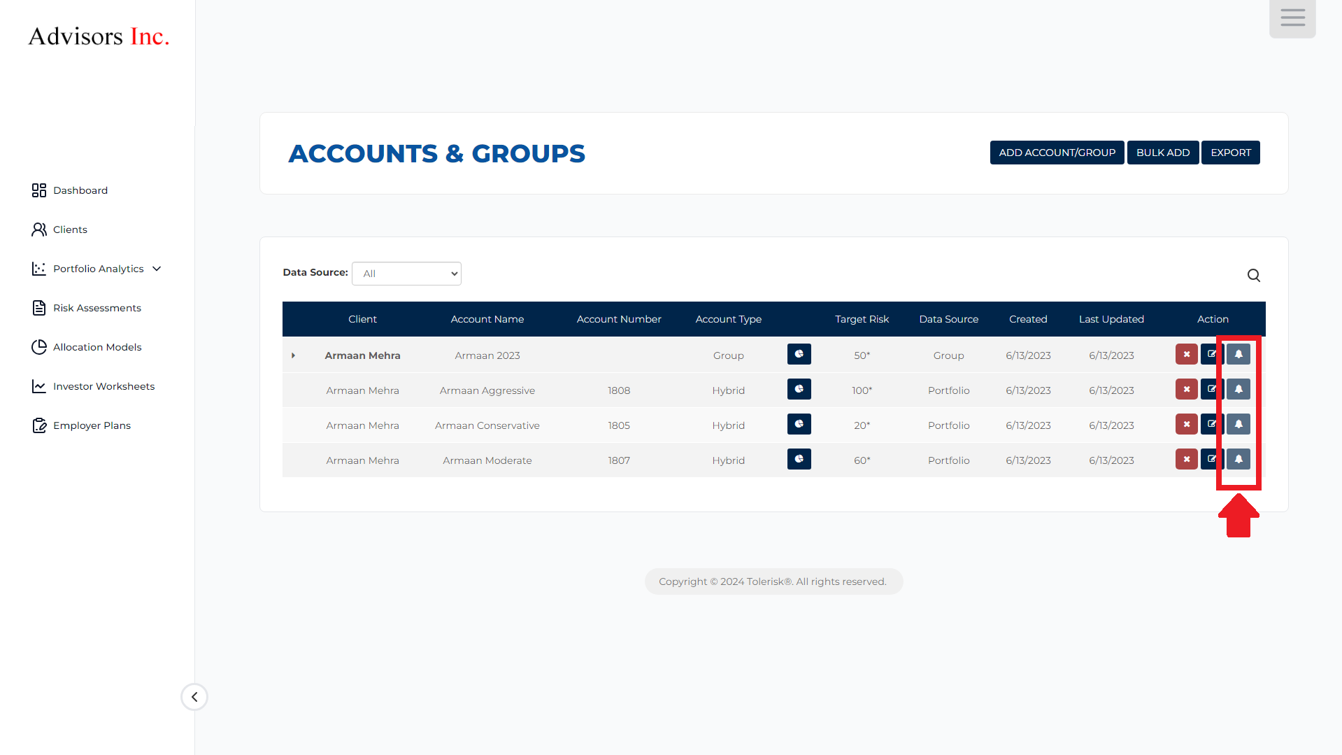 - To adjust target risk, you can go back to the accounts or groups page and click on the edit icon for the account or group you want to edit.