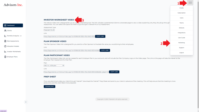 - You can also generate a generic link by heading to the "Marketing" tab, located under the dropdown on the top right side of the site. The link generated here will include a video, which is displayed to your clients before they start the assessment.