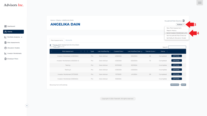 Investor Worksheets allow you to collect data from your clients, so that you can use it to run risk assessments. These worksheets can be sent to multiple clients/ prospects at once, or customized for individual clients/households.