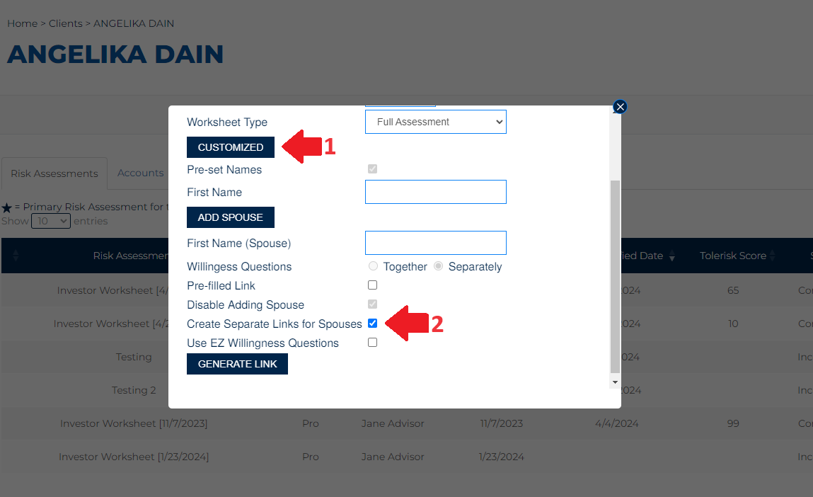 - Client-specific links can be customized in a multitude of ways - you can send partial assessments if you have existing information about your clients, pre-set names, disable adding spouses, and even create separate links for spouses.
