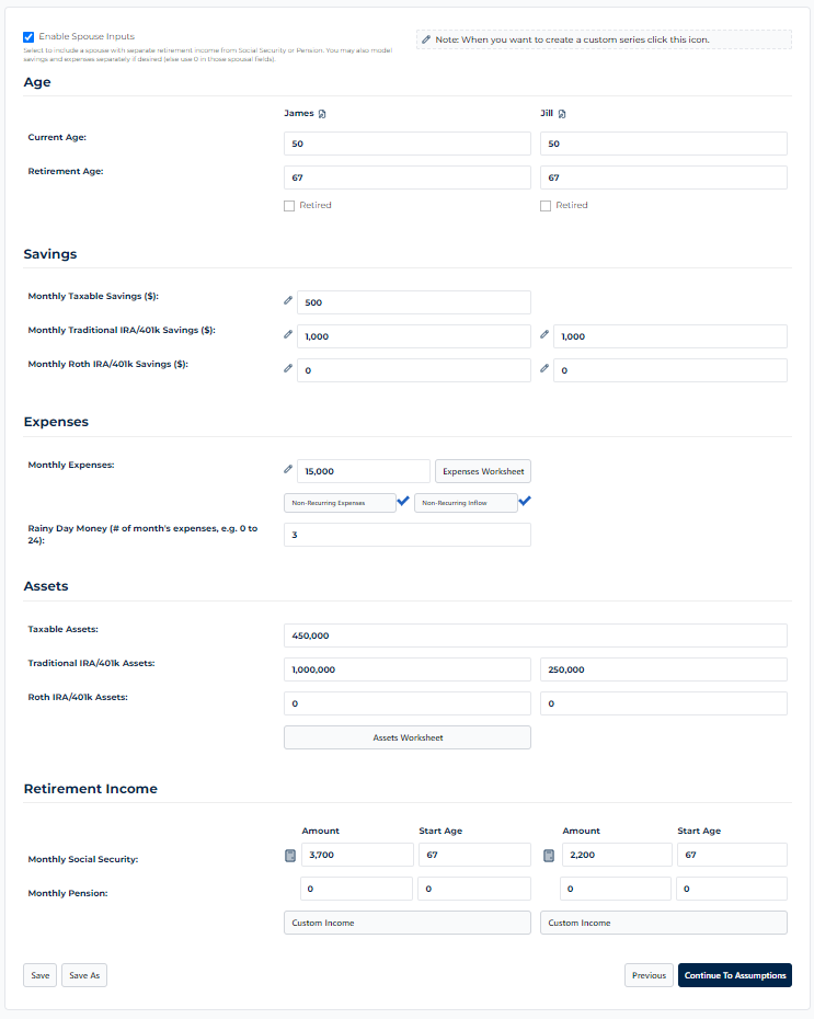 - The only required fields are current age, retirement age, Monthly expenses, and Assets. Everything else is optional but highly recommended.