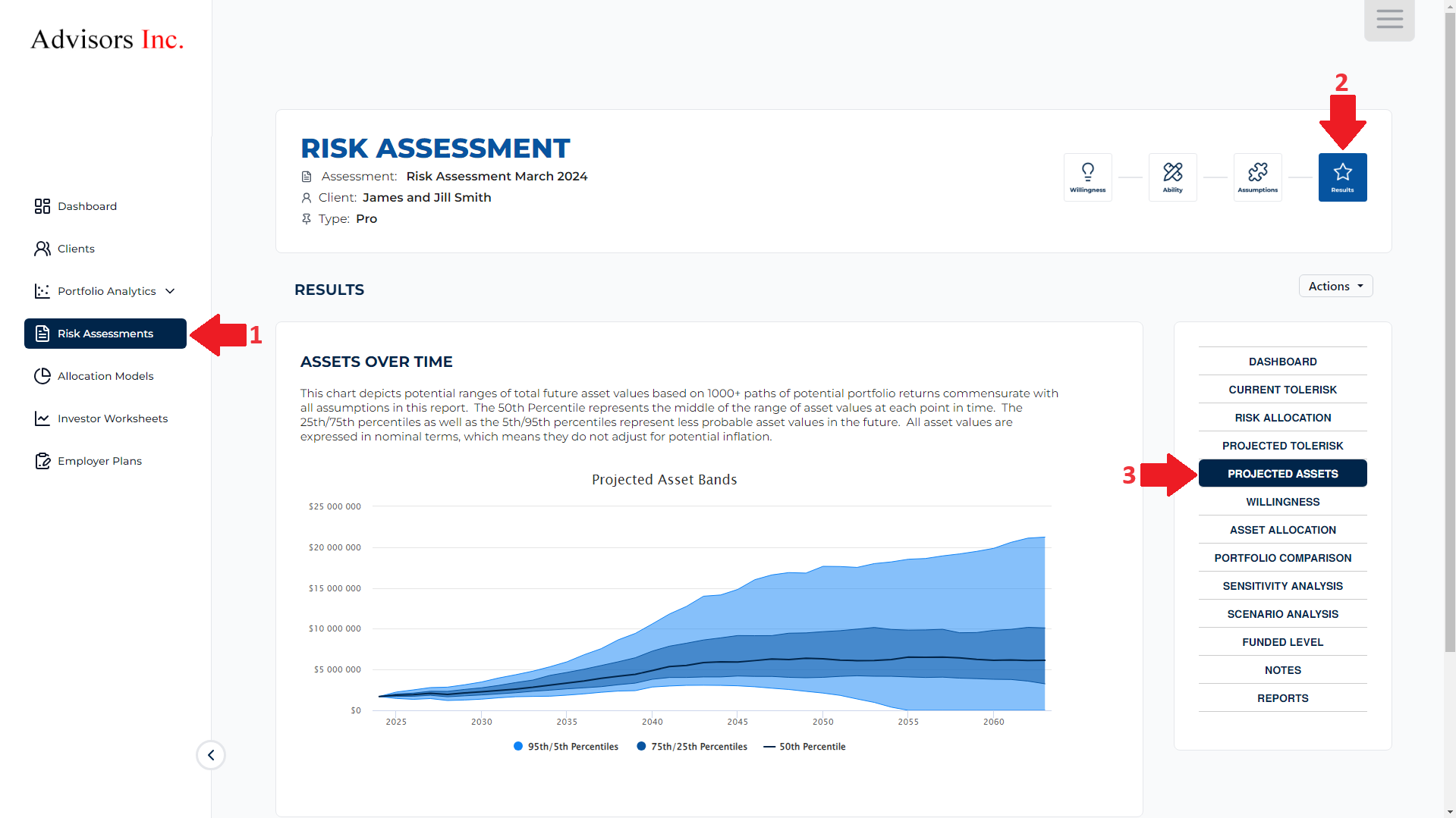 The Projected Assets chart represents your clients' assets over time based on 1000+ paths of potential portfolio returns combined with all assumptions in their reports.