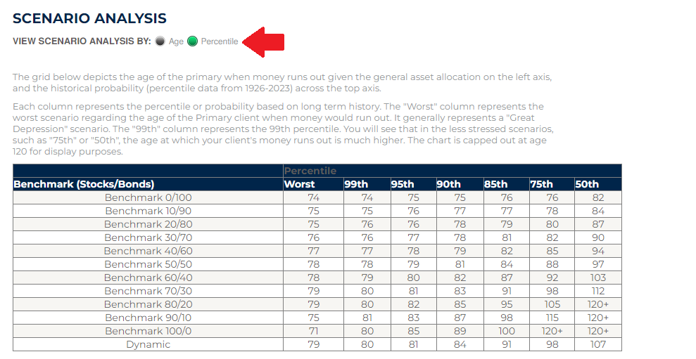 - By selecting the "Percentile" option at the top of the page, you can see the statistics from the other perspective. For each probability, you can see what age the client's money will run out for the specified asset allocation.