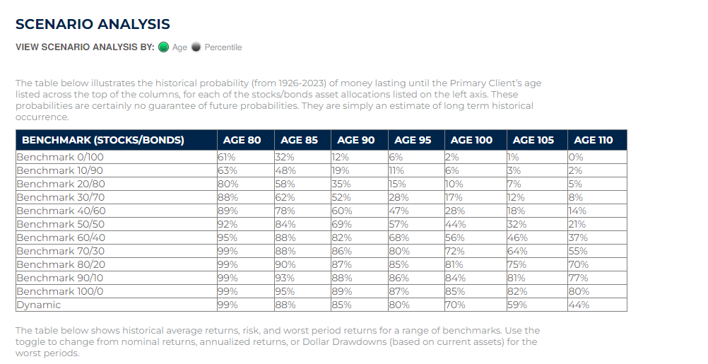 - The scenario analysis produces the conventional probability of success. Each age shows the probability that money will still be available for the client.