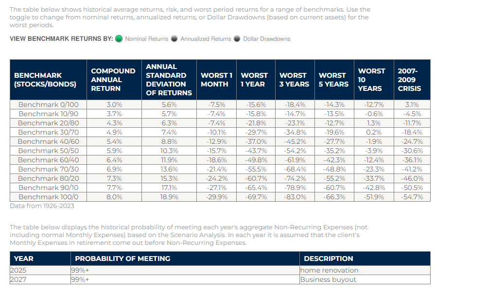 This section produces the conventional probability of success with respect to historical data and your clients' personalized Tolerisk score.