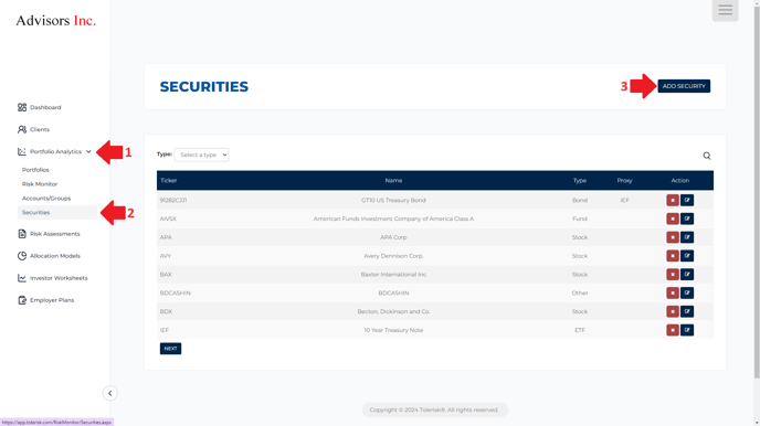 The Securities page is an integral component of our Portfolio Analytics features, providing a platform to document your securities effectively.