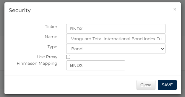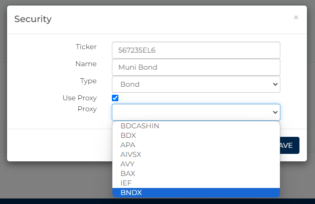 - Click “Add Security” again and add your bond (or another security that requires a proxy), ensuring to check the “Select proxy” box this time.
