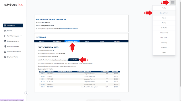 Tolerisk provides a unique referral link that you can share with advisors in your network. This link allows others to explore Tolerisk, and you will benefit from referral incentives.