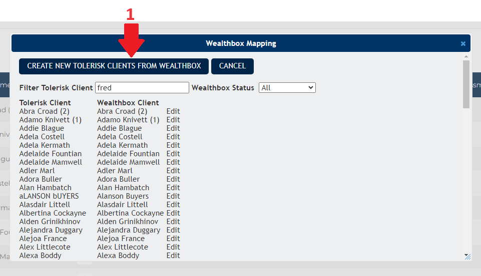 - Open Wealthbox mapping under the actions tab and select the button that reads “Create new Tolerisk clients from Wealthbox.”
